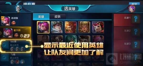 2)在排位赛征召模式中我们增加了队友最近常用的三个英雄的显示,这可以在大部分情况下展示出自己方的队友选用英雄的倾向,避免玩家在禁选英雄时候的冲突,当然玩家有权利关闭掉自己的常用英雄显示不给本方玩家看到。