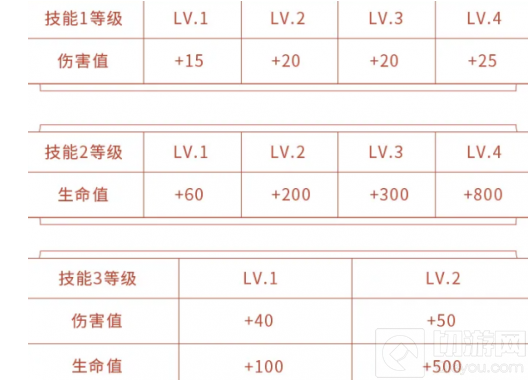 ②一共3个技能,1、2技能分别4级,从经验等级1级开始可升级;3技能共2级,从经验等级5级开始可升级。