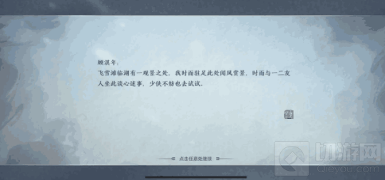 这个地方是飞雪滩边上的一座小亭,旁边有桥有湖,找一下就可以看到了,然后进去亭子里就会看到描绘的交互键了。