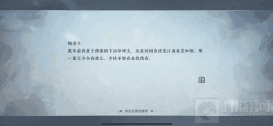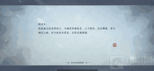 接取到任务后,通过传送来到江南找到画师顾淇年,跟他对话后接取帮他勾勒如画江山的任务,我们就会得到一个文字线索,然后要根据这个线索来找到相应的地方描绘。