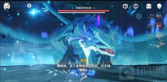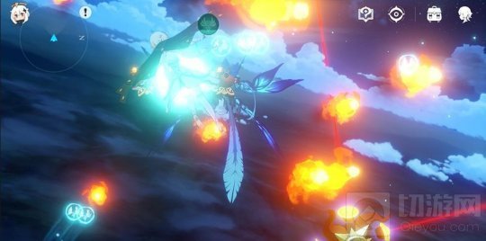 风魔龙还有个终极技能,首次施放将有提示(之后有龙的特写镜头就意味着将放技能了),施放之后地上将有多个蓝圈,随后落下光炮,温迪提示我们平台转移,由于平台边缘有风场,我们可以借助风场起跳开伞进行平台转移,建议提前转移平台,避免受重创及刷新龙护盾。