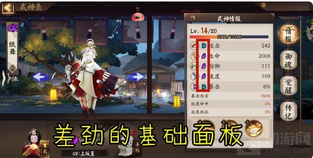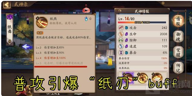 技能详细解读纸舞是一个SR阶的式神,但是在基础面板上一个S级的基础属性也没有,这个属性确实有点差劲了,书翁好歹还是5个A级的属性,纸舞这边竟然还有两个B级的基础属性,除了稀有度让纸舞低调以外,这个基础面板也确实没有什么可取的。基础已经很差了,就更加需要技能上的特殊来进行弥补,作为一个SR阶的式神,这种面板甚至还不如大部分的R卡,不过还好在技能上有与众不同的点,只是基础面板依然是短板。