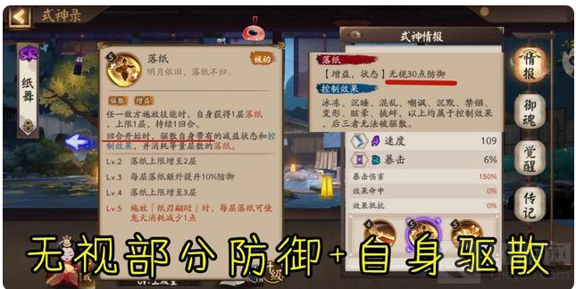 最后来看纸舞的被动技能,在任一敌方释放技能的时候,纸舞自身就会获得一层“落纸”buff,该buff的上限是3层,每一层可以无视对面30点防御,并且每一层buff会给自身提升10%的防御值,buff只会存在一个回合。当纸舞释放大招时自身存在的“落纸”buff层数会减少鬼火的消耗,最高可以让大招零鬼火释放。被动还有驱散的效果,在纸舞的回合开始前,根据“落纸”的层数,驱散纸舞自身带有的debuff和控制效果,也是最多驱散3个,毕竟“落纸”只能叠3层。