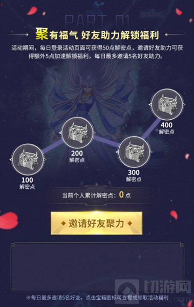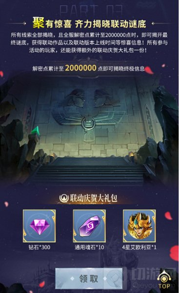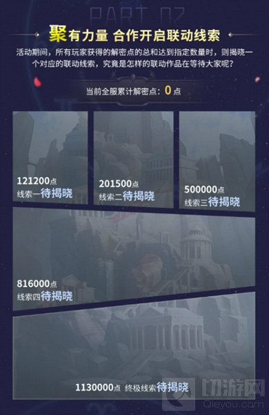 玩家每天登录活动页面聚力小宇宙可获得解密点,当所有玩家的解密点总和达到一定值时,可以解开一个联动线索,解开所有线索后,不仅联动作品的真面目会被揭开,参与活动的玩家还能获得联动庆贺豪华礼包哦,快叫上好友一起助力参与吧!