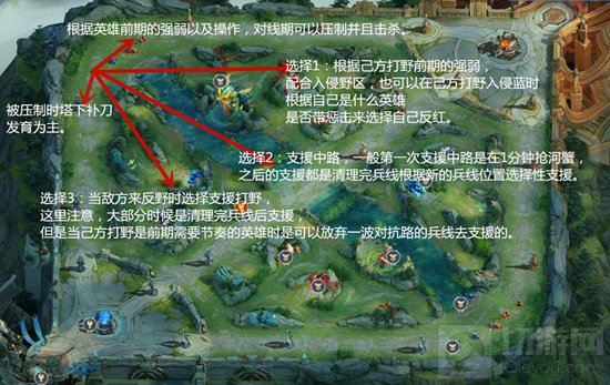 3,支援进攻or支援防守(根据己方打野英雄强弱选择支援打野的入侵和防守野区,均势时,需要自身打破局势则选择支援中路。)。