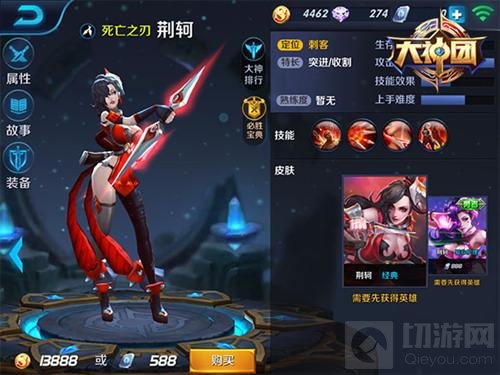 再一把泣血之刃可以提高荆轲吸血率,同时提高其消耗能力,可以跟坦克英雄慢慢磨血,进攻时尽量不使用大招,以免脆皮输出一来无法躲避。破甲弓出了更容易击杀坦克外,也提升了荆轲的攻击力。