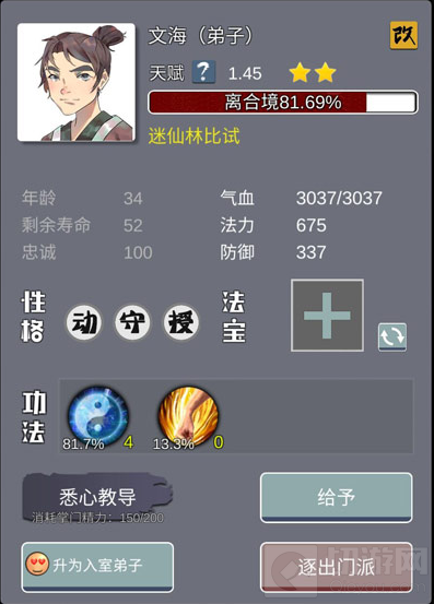 3.功法:开山立派后要求主选一门功法,这个看自己喜好。因为后续学到的功法成长加成都没有主心法高,所以你主攻击还是防御就看第一次选择了。(法力=攻击力)