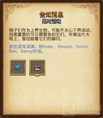 不思议迷宫五只猴子在哪?不思议迷宫11月26日的周年庆活动上线,这次的活动里有一个比较特别的任务。任务需要玩家们前往混沌深渊和Peter、Vincent、Yorick、Ben、Danny对话,而这几只猴子的地点都比较难找,因此这里就带来了它们具体的位置攻略。
