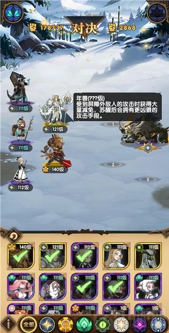 我们开手动,前期只开启双子与光女的大招,其他英雄保留能量。在年兽第一次破盾的时候,开启自动模式打伤害,只要输出足够,往往可以直接让年兽进入二次破盾,这也是之前卡能量的原因,最后一直开自动即可。