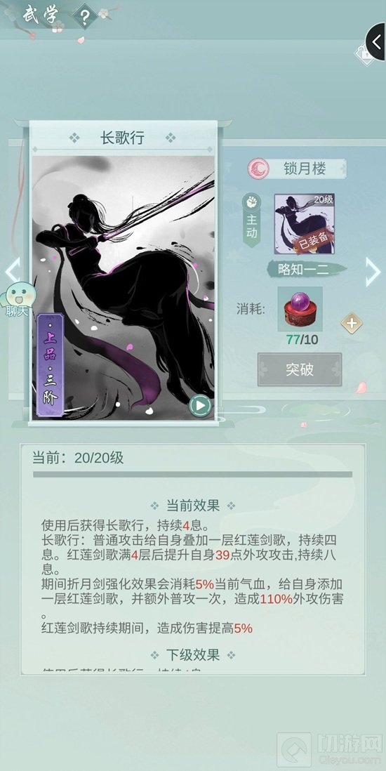 如果四个技能没凑齐的话 少剑荡影响小一点 长歌和折月是核心技能 少飞影输出少一半