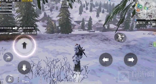 刚开始使用滑雪板的话,可能有些不习惯,当你靠近滑雪板以后会出现一些图标,可以从图中看出来前进后退的标志,按住前进图标就可以直接滑动了。这里说一下一定要在雪上滑动,如果你到了路面上是滑不了的,毕竟是滑雪板。
