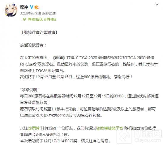 今日(12月11日)TGA 2020展会正式落幕。《原神》官方微博发文表示在大家的支持下,《原神》入围“最佳移动游戏”“最佳RPG游戏”提名。虽然最终没有获奖,却有幸登上TGA国际舞台。官方决定送上800原石的谢礼,感谢大家。
