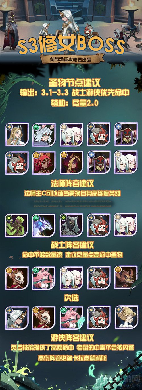 剑与远征S3团本在游戏中想要能够轻松的完成挑战,那么对于boss的打法阵容还是非常的需要去了解的,在游戏中的胜利不是那么容易取得的,下面就具体的s3团本boss攻略阵容,每一个boss打法都是不一样的,大家的角色养成也是不同的,所以还是需要根据自己的角色作出一些不同的选择。
