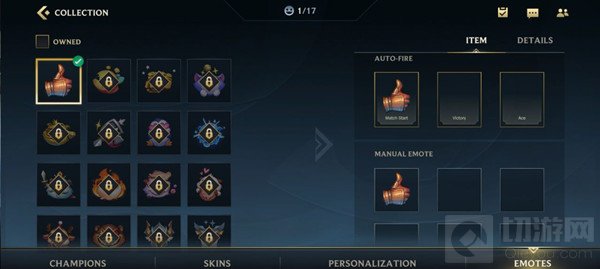 来到collection界面后,点击底栏第四个选项【EMOTES】,获得的表情就是在这里佩戴的。
