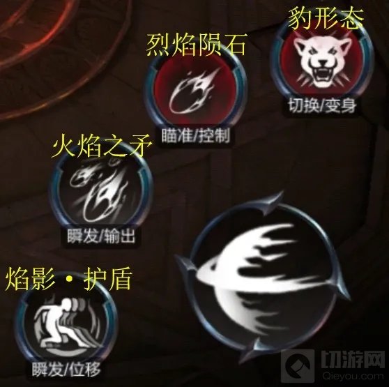 人型技能:1焰影·护盾,2火焰之矛,3烈焰陨石,4豹形态