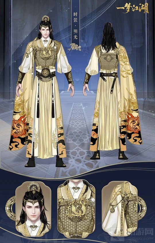 首先是这套“时装·明光素晖”,男装明光以日神为设计灵感,女装素晖的设计来源则是月神,这两身衣服款式华丽端正,一个身披金甲威武神勇,一个白衣细纱仙姿玉貌,而且男女款式的设计上增加了许多互相呼应的小细节。