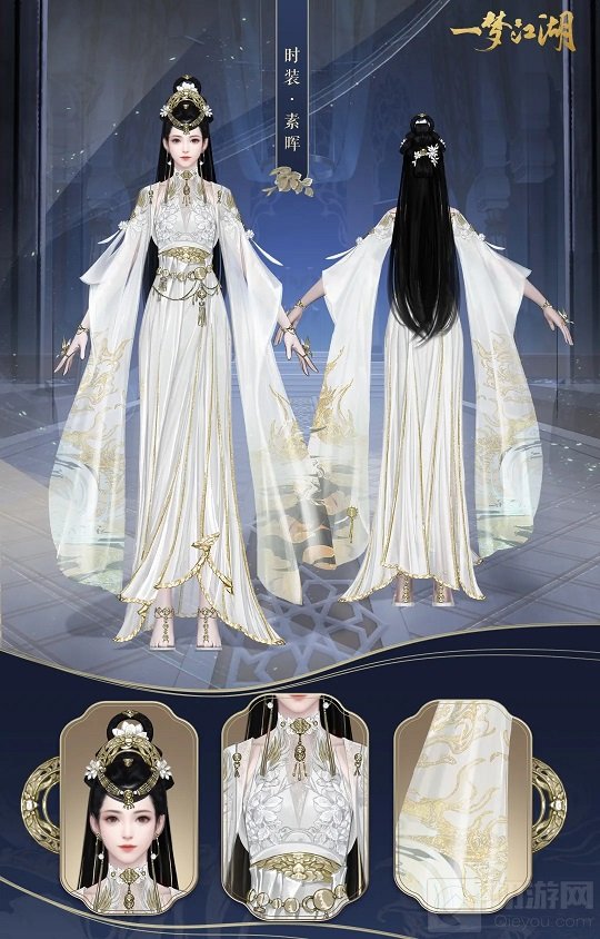 穿上素晖的女侠身着白衣细纱,肩膀与胸前布满昙花,裙摆的金色刺绣更是仙气飘飘!
