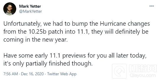 拳头公司英雄联盟设计师Mark Yetter于今日(12月16日)在推特上发布了一则公告,表示此前公布有关“卢安娜的飓风”的装备改动不得不推迟至明年的11.1版本才能上线。
