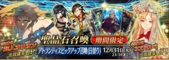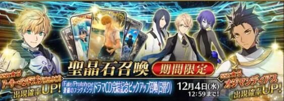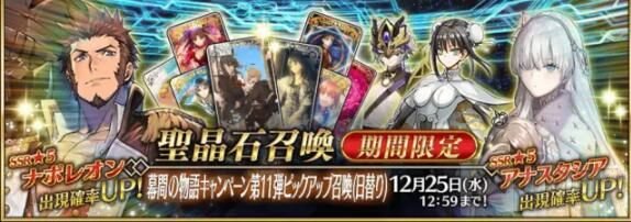 从者 ★5(SSR)刑部姬(Assassin) ★5(SSR)吉娜可·加里吉利(伟大的石像神) ★4(SR)托马斯·爱迪生 ★4(SR)童谣