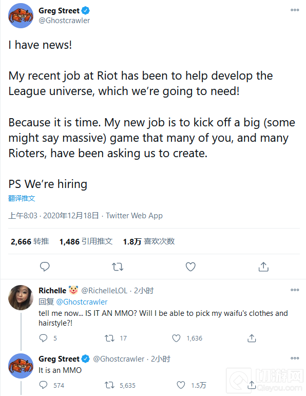 鬼蟹在推特上写道:“我有个新消息!我在拳头的最新工作是协助开发我们需要的(英雄)联盟宇宙世界观新作。现在也是时候告诉大家了。我的新工作是制作一款大型(有的人可能说是巨型)游戏作品,并且这也是很多玩家、员工们一直要求制作的项目!PS:我们正在招聘人手。”