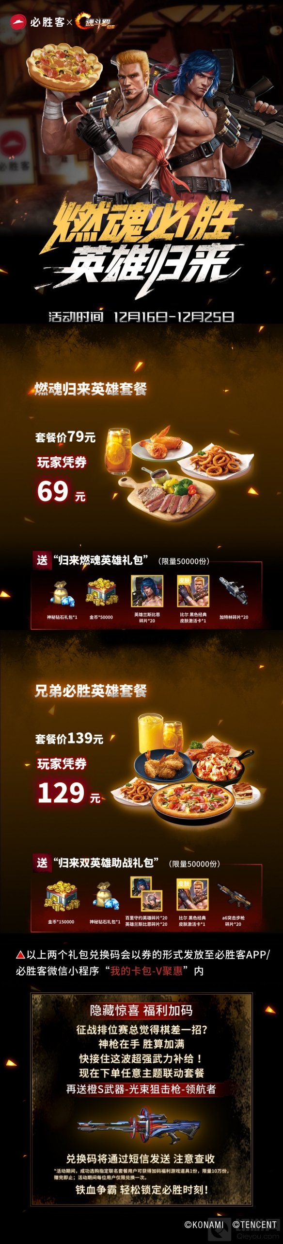 必胜客x《魂斗罗:归来》“燃魂归来”英雄套餐,玩家凭券69元,送“归来燃魂英雄礼包”;“兄弟必胜”英雄套餐,玩家凭券129元,送“归来双英雄助战礼包”。