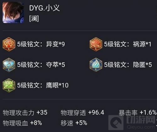 铭文方面,小义的选择是9个异变、1个祸源、5个夺萃、5个隐匿和10个鹰眼。澜的技能对于暴击没有加成,而且也很少需要用到普攻,所以异变与鹰眼提供的穿透便变得弥足珍贵。而5夺萃可以保证澜更好的续航,确保澜在一轮GANK过后,即使残血也能通过夺萃与2技能的效果回复血量,减少回城次数,前期更好打出节奏。
