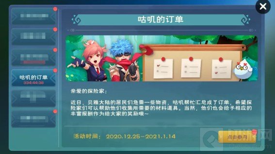 2020年12月25日-2021年1月14日期间,20级及以上的小伙伴可在“活动”界面,点击“咕叽的订单”页签参与活动。