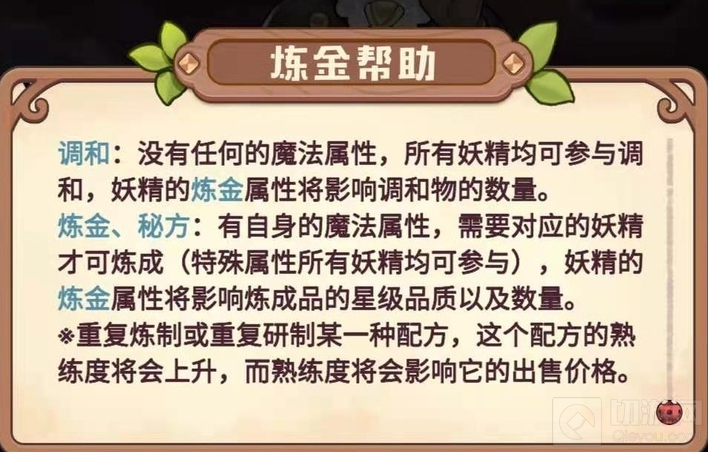 炼金每次只能上一只妖精,大部分配方都需要对应属性的妖精,炼金数值越高产出越多,所以炼金用来营业出售的产品要选择炼金数值最高的妖精对应属性的产品最好,最好固定几个常用配方。