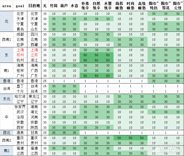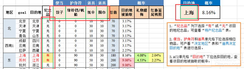 如果使用除千纸鹤之外的其他护身符或便当,是增加对应区域内所有目的地的数值(下图表1数值加到表2上),只是增加对应目的地数值,抽取目的地时还是28选一。