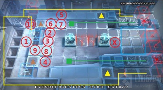敌人主要从中间三路进攻。最上和最下两条黄线路线是游击队传令兵的路线,传令兵出门之后会站一会,然后下楼梯从左上角再出来。左上出生点在中后期会大间隔出一个术士,传令兵和左上角的术士,都会往最下方的防守点走。