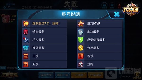 MVP:即KDA值最高的人,胜方MVP为当前胜利队伍的最高KDA的人。败方MVP为失败方