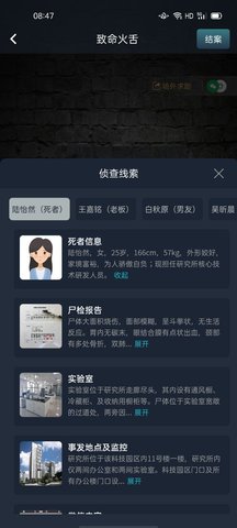 2021年1月8日19:35,上海警方收到某科技园保安报案,报案人称科技园内某研究所有一位员工于实验室内身亡。警方立即前往并封锁现场;经调查,警方已锁定四位嫌疑人。因本案性质恶劣,警方现选择将线索公开,希望全球侦探 协助调查。