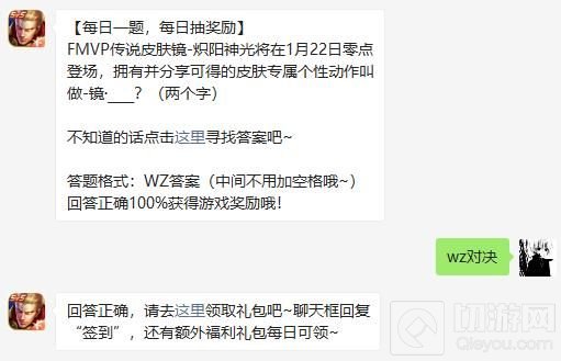 一、FMVP传说皮肤镜-炽阳神光将在1月22日零点登场,拥有并分享可得的皮肤专属个性动作叫做-镜·____?