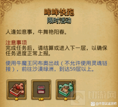 使用牛魔王冈布奥出战(不允许使用灵魂链接),前往沙漠绿洲,到达59层以上。
