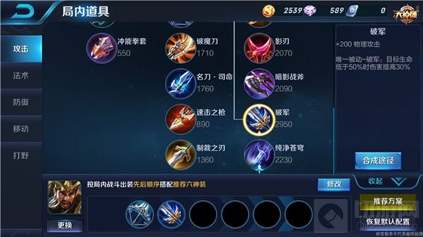 关羽的1技能虽然是AOE伤害,但是攻击范围小,这就意味着要和对手打近身战。不过对于关二爷来说,近身并不是难事,难事在于近身后怎么打出控制和伤害。因为关羽的所有技能配合被动效果,能够冲锋快速接近敌人。出到破甲弓是因为在对手即使在有物理防御装备,该受到的伤害依然存在。而破军则是让关二爷的单挑能力更上一层楼,因为关羽可以在线上借用冲锋消耗对手血量。一旦对手血量降低到50%以下,关羽再前去攻击,将会触发装备的被动效果,伤害得到巨幅提高,谁人还会是他的对手。