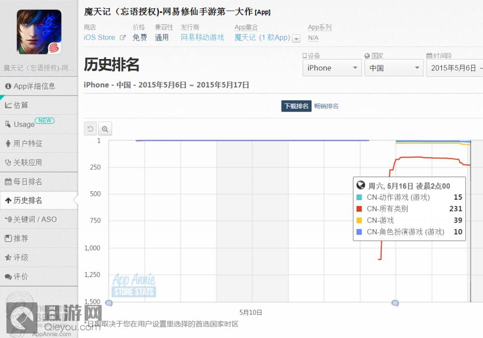 5月16日凌晨两点,由网易代理、上海方寸开发的手机游戏《魔天记》突然从苹果榜单排名消失。消失前,《魔天记》处于下载榜总榜231名,畅销榜总榜19名的位置。截止发稿,时间已经过去整整一天半,《魔天记》的排名没有复原。
