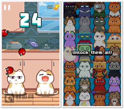 《吧唧猫》(Nom Cat)这款由Lucky Kat Studios制作发行的新作里有一群nia~nia~乱叫的喵星人!玩家要做的是同时控制两只喵的大嘴,让他们吞下空中飞来的小鱼,避开危险的炸弹(谁扔的!)。还要注意的是浪费可耻!要是有鱼掉在地上那也同样会Game Over,你能创造多高的分数,又能靠收集到的小金鱼解锁更多的喵星人呢,被《吧唧猫》萌到了就来试试吧。