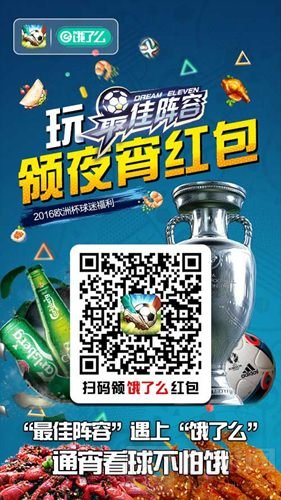 对于欧洲杯这样的晚上21点至凌晨5点超长足球盛宴,虽说球迷能获得丰盛的精神享受,但还是会“感觉身体被掏空了”。熬夜看球,没有夜宵身体怎能吃得消?为此,最亲近球迷的足球手游《最佳阵容》携手“饿了么”,开始为玩家“充电”啦!即日起只要扫描活动二维码,就可以获得由《最佳阵容》携手“饿了么”为球迷提供的夜宵红包,享受一边看球一边吃夜宵的幸福时光!