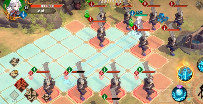 (1)开局击杀左边小兵后直接向上方使用三技能。(2)穿过第一波西夏军以后直接走至另一波西夏军中间用二技能收割。(3)击杀赫兰铁军时注意优先使用三技能再补普攻,有减防效果。(4)中途规避一回合,等待剑使威仪冷却(每两回合可触发一次)。