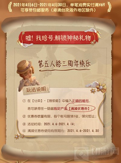 在游戏内嵌商城(玩偶之家)【分类】的搜索框中输入正确暗号,即可解锁任一隐藏指定产品满减优惠券,谜底就隐藏在图中,侦探们一起来猜猜看~(优惠券数量有限,每个账号限领1张,领完即止)