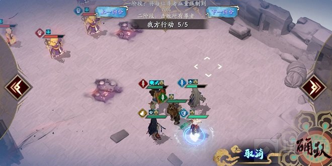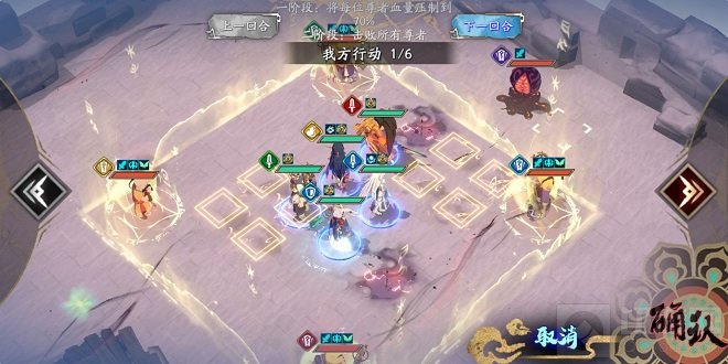 第5回合。冰璃对光咒师放幽剑,阴歙原地等待,白菀走到殷剑平右侧放神氛尉迟良对雷咒师放天机(反击后需要剩残血),殷剑平放日轮击杀雷咒师。敌动阶段,光咒师必定选择普攻尉迟良,阴歙抗住。