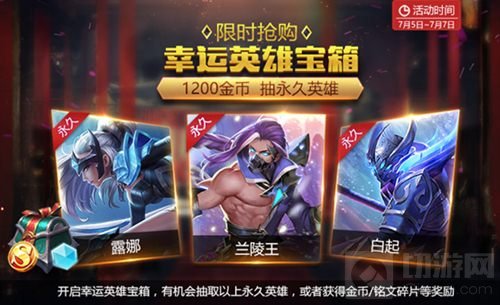活动期间,使用1200金币开启幸运英雄宝箱,有机会抽取露娜、兰陵王、白起英雄永久!