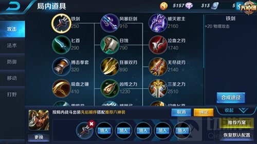 作为战士时关羽的出门装推荐选择铁剑,增加自己的物理攻击力,可以快速的清理兵线,然后运用前期伤害高灵活性好的特点去敌方野区骚扰,干扰敌方发育或是支援配合队友抓人。