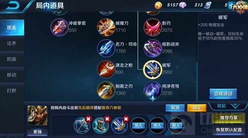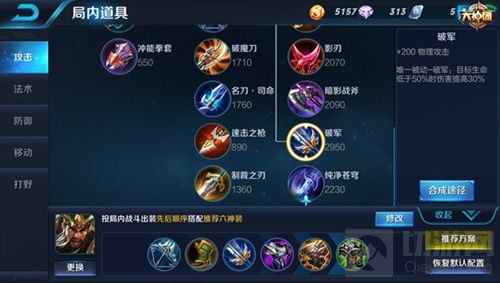 中期装备选择相比于前期更加丰富多样,但是在选择上要注意的是结合场上的局势,灵活的选择。做为战士时,中期装备第一件推荐出破甲弓,提高一下自身的攻击力,同时破甲弓的被动破甲效果在面对高护甲英雄时依然可以打出不错的伤害,无论是在前中后期都是一件十分有用的装备。第二件则推荐抵抗之靴,增加自身的移动速度,可以让关羽更快的进入冲锋状态,打出高额的伤害,同时被动增加韧性,可以减少被控制的时间,让关羽可以更流畅的跑起来,进入冲锋状态。当然在对方控制技能不太多,刺客类英雄多时,则可以换成影忍之足,减少普攻受到的伤害。第三件装备推荐出破军,大幅增加自身的攻击力,被动还可以对生命值低于最大生命值50%的英雄造成的伤害提高30%,配合上冲锋状态单刀赴会的伤害,简直可以做到秒杀残血脆皮,让敌方毫无反抗的成为刀下鬼。