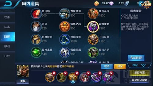 作为坦克时,第四件装备则推荐出反伤刺甲,增加物理防御,同时被动还可以反伤,可以让敌方伤己一千,自损八百,苦不堪言。第五件装备则推荐选择暗影战斧,提高自身生存能力的同时也可以补充一下输出能力,能却缩减也可以让关羽的技能CD得到缩减,可以更频繁的释放技能保护队友或是控制敌方。最后一件装备则推荐选择霸者重装,让关羽肉到没朋友,更好的起到为队友吸收伤害创造输出机会的作用。