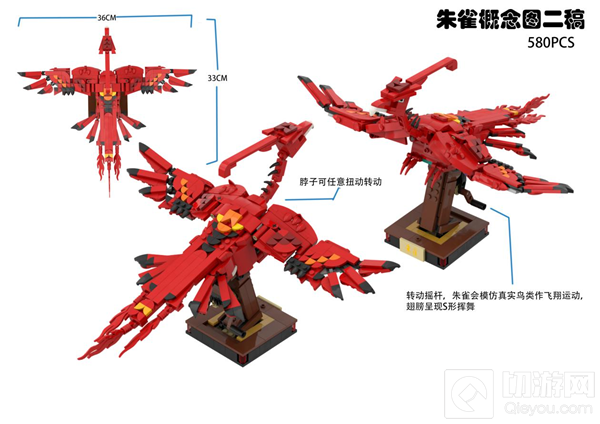 同时,忠信社还推出创新概念版“朱雀”,在原有基础版上再创新设计,以神话中“朱雀”形象为基础,设计具象化,细化了更多的局部,更加了可动性,以转动摇杆来模仿真实鸟类的飞翔运动,更具动态神韵。赤红如火的身躯上有点点火光点缀,一如神武再临。这次也将会在展会上一一展现给大家,让我们拭目以待!