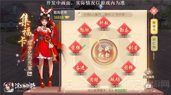 汴京福卡至,瑞光耀浮世。《浮生为卿歌》手游集福卡活动即将强势来袭!阁下等级达到15级后将自动开启;活动分为集福卡阶段以及开启红包阶段,在集福卡期间阁下可自由获取福卡或与别人交换并合成红包;在合成后待到进入开启红包阶段后即可开启,一同瓜分元宝奖励。此外,阁下每获得一张新卡将增加一次刮刮乐机会,刮开就有机会获得大量珍贵道具奖励哦!