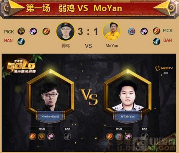 B组的第一场较量在不久前夺得中欧对抗赛冠军的NewbeeRuoji和WEMoYan之间展开,弱鸡表现稳健,以 3:1 战胜了MoYan轻松进入胜者组。