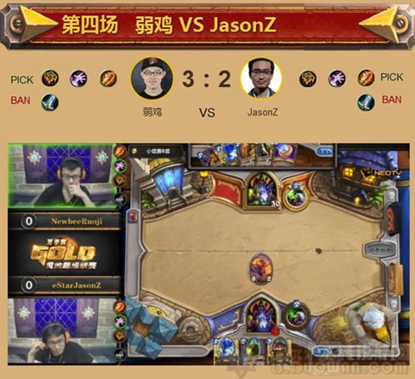 决胜局在两位选手的火妖法内战中展开,这一次NewbeeRuoji的手牌明显优于对手,很快就将eStarJasonZ的血线打入了安全线下。为求自保,eStarJasonZ不得不忍痛将法术进行解场,但最终还是没能等到尤格萨隆的返场。NewbeeRuoji再次以 3:2 击败了eStarJasonZ,成为B组第一个出线的选手。