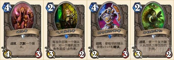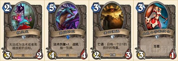 大地之环先知的原因是这主要是张术士用来对付法师的牌。大部分卡组里用处不大。烈日行者出得太晚,赶不上卡组进度。铁喙猫头鹰则是因为属性不好。